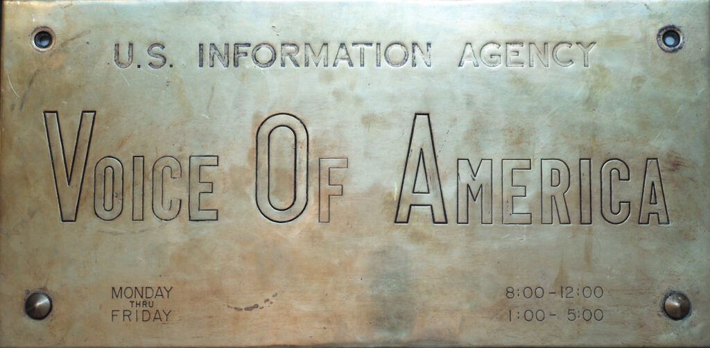 Tablica, która była umieszczona na budynku Głosu Ameryki w Waszyngtonie do czasu zlikwidowania Agencji Informacyjnej Stanów Zjednoczonych, United States Information Agency (USIA) w 1999 r. Tablicę zakupili dla Muzeum Radia Zimnej Wojny byli pracownicy Głosu Ameryki.