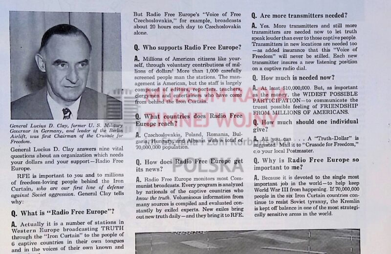 Generał Lucius D. Clay, były gubernator wojskowy USA w Niemczech i organizator berlińskiego mostu powietrznego, był pierwszym przewodniczącym Krucjaty Wolności. Po II wojnie światowej Krucjata Wolności zbierała fundusze od osób prywatnych i firm w Stanach Zjednoczonych na rzecz Radia Wolna Europa. Jednak prawie wszystkie niezbędne fundusze pochodziły potajemnie z budżetu ...