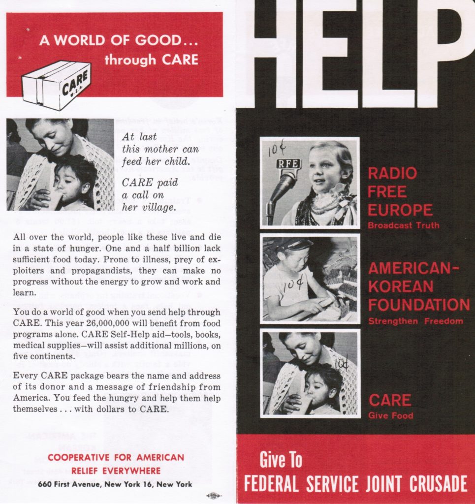 Strona zewnętrzna broszury z 1963 roku przygotowanej na potrzeby kampanii Federal Service Joint Crusade – systemu dobrowolnych zbiórek prowadzonych w instytucjach federalnych USA. Publikacja łączyła w jednej narracji pomoc humanitarną (CARE), wsparcie dla odbudowy Korei Południowej (American-Korean Foundation) oraz działalność Radia Wolna Europa, przedstawianego jako inicjatywa obywatelska niosąca „prawdę za żelazną kurtynę”. Układ graficzny i język broszury miały budować wrażenie wspólnej, moralnie spójnej misji humanitarnej i wolnościowej.