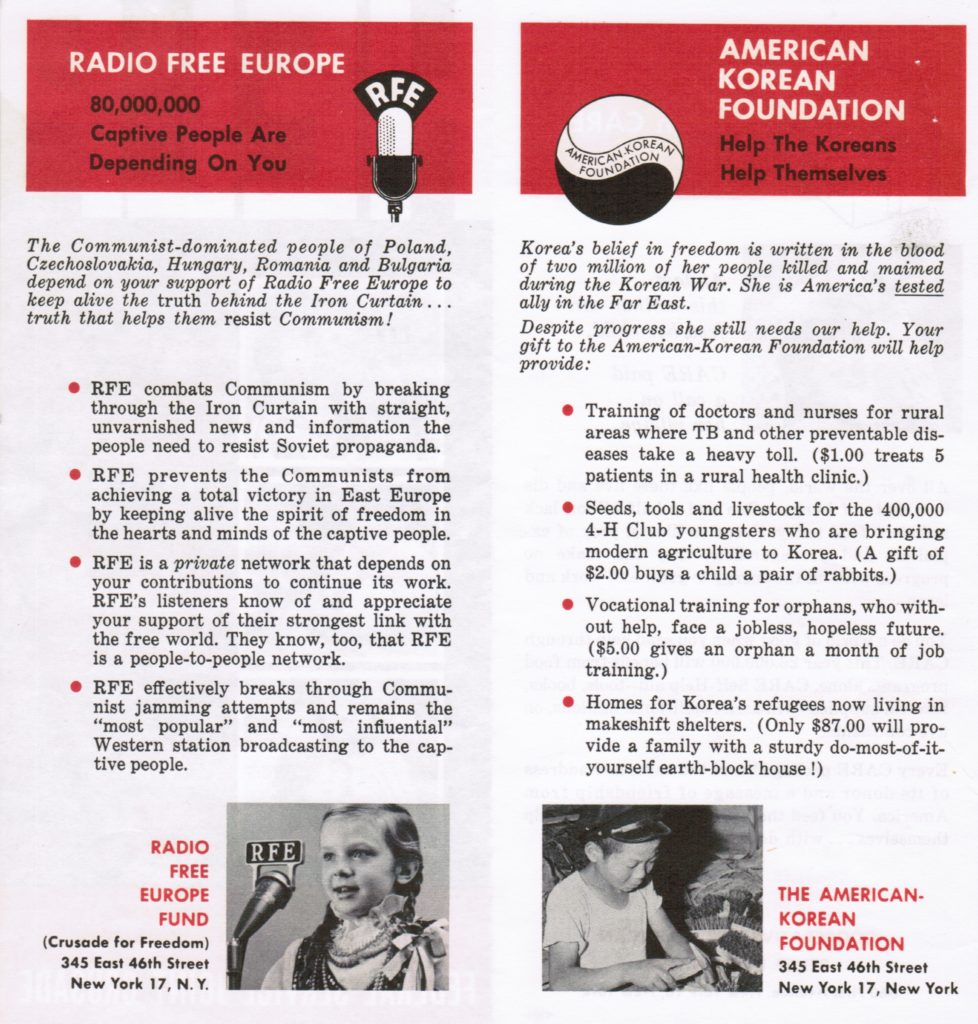 Strona wewnętrzna broszury z 1963 roku zawiera szczegółowy opis działalności Radia Wolna Europa, skierowany do amerykańskich darczyńców. Tekst podkreśla, że mieszkańcy Polski, Czechosłowacji, Węgier, Rumunii i Bułgarii „zależą od wsparcia” RWE, które dostarcza nieocenzurowanych informacji i przeciwstawia się propagandzie komunistycznej. RWE przedstawione jest jako „sieć ludzi dla ludzi” (people-to-people network), finansowana z dobrowolnych składek. Równolegle zaprezentowano cele American-Korean Foundation, co pokazuje, jak działalność informacyjna RWE była w USA zestawiana z klasyczną pomocą humanitarną w ramach jednej kampanii zbiórkowej.
