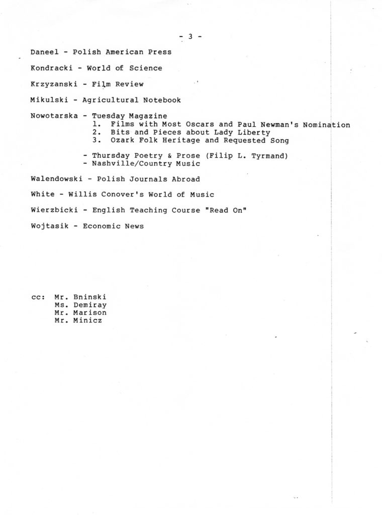 Trzecia, końcowa strona raportu Tadeusza Lipienia, dokumentująca audycje kulturalne, naukowe i muzyczne Sekcji Polskiej Głosu Ameryki – od recenzji filmowych i literackich po „World of Science”, „Willis Conover’s World of Music” i naukę języka angielskiego.