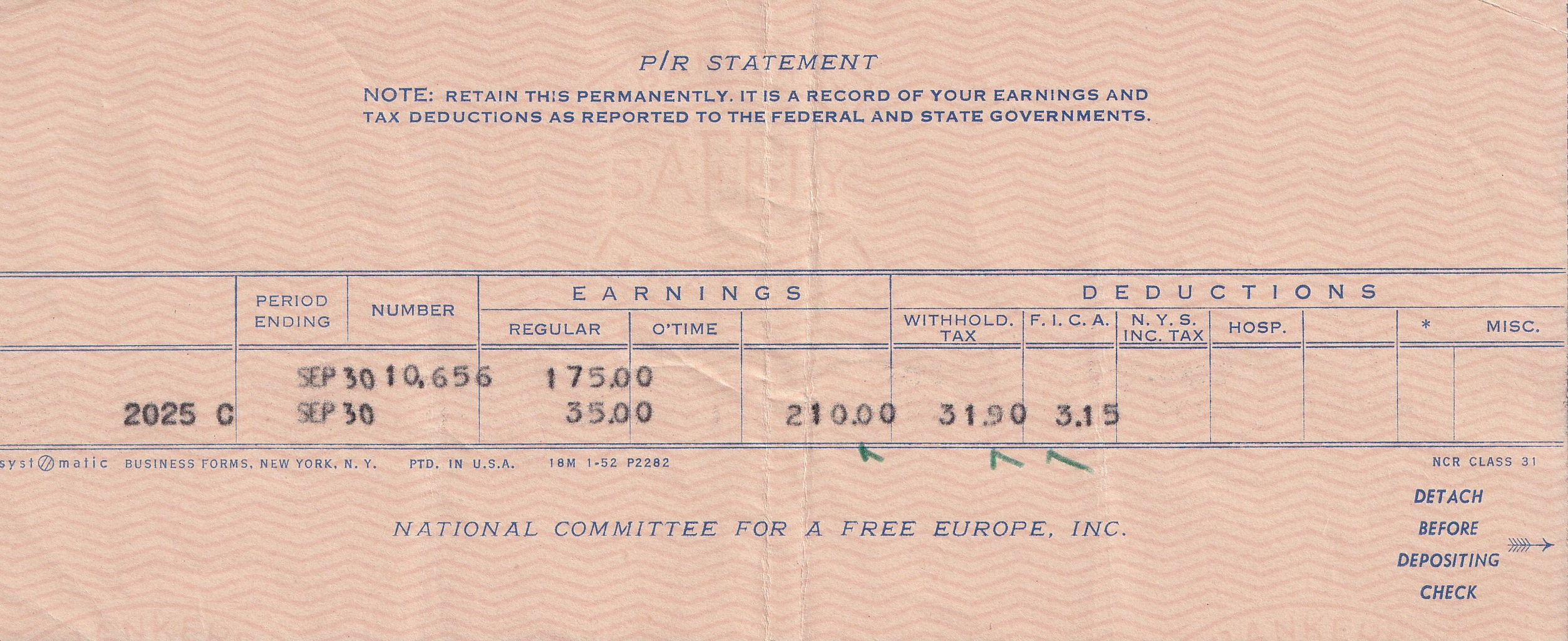 Prezentowany dokument jest oryginalną listą płac wystawioną przez National Committee for a Free Europe, Inc. (NCFE) – oficjalnego, cywilnego sponsora Radia Wolna Europa w pierwszym okresie zimnej wojny. Zawiera zestawienie wynagrodzenia zasadniczego i nadgodzin oraz potrąceń: federalnego podatku dochodowego, składek na ubezpieczenie społeczne (FICA) oraz podatku stanowego stanu Nowy Jork.